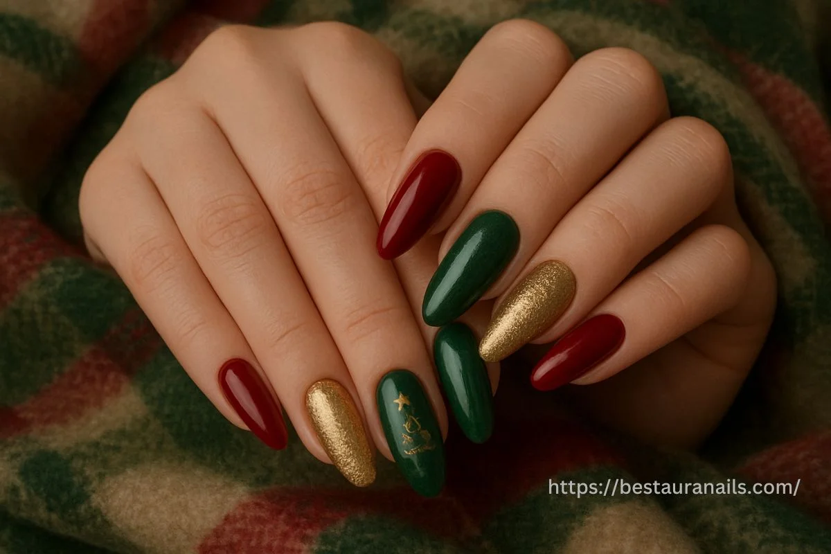 Plaid nails can mix multiple shades or include metallic stripes for extra shine. Textured manicure also pair well with glitter or subtle matte finishes to create contrast and highlight the holiday details. For a classic Christmas plaid, use red, green, burgundy, and gold, or combine emerald and deep red for a modern festive twist.
